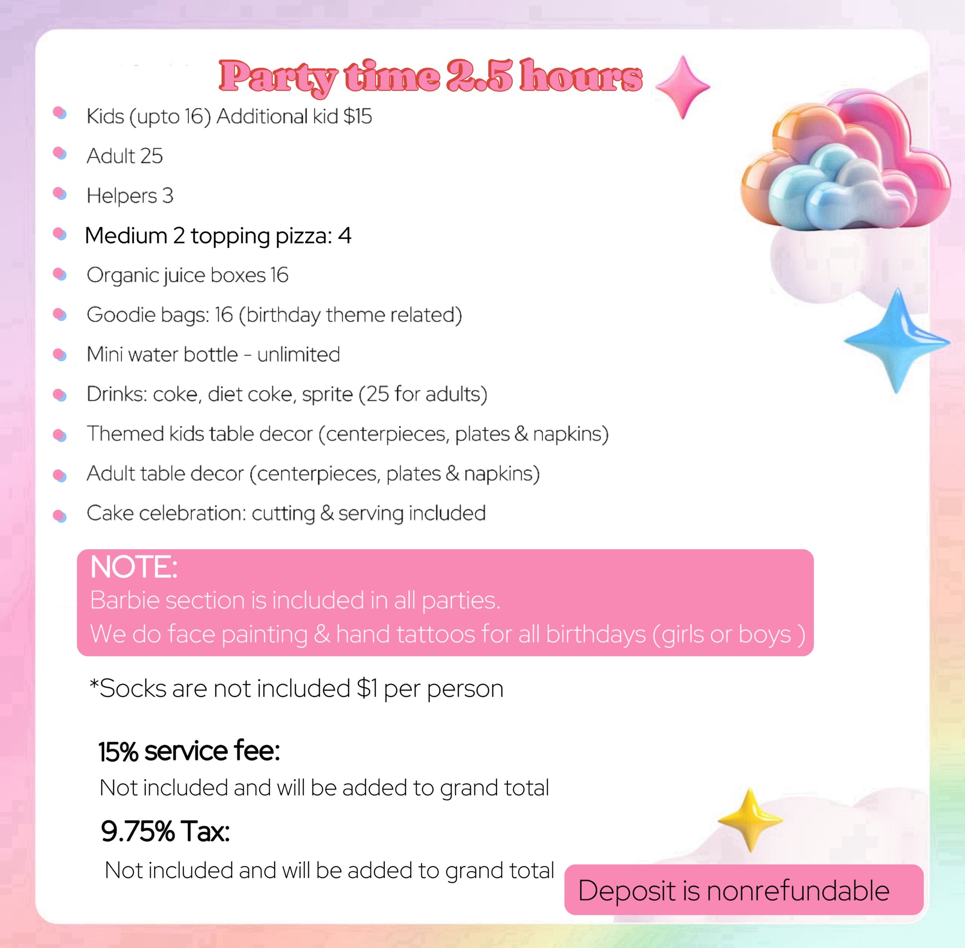 Make it a party to remember with 2.5 hours of fun for 16 kids and 25 adults, complete with themed decor, goodie bags, and all the party essentials.