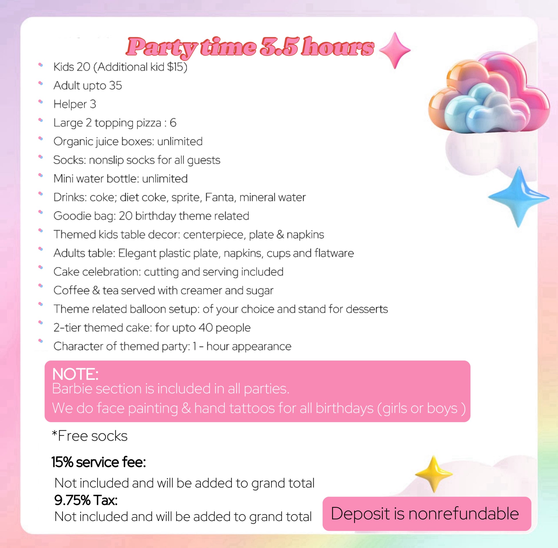Give your child the VIP experience with 3.5 hours of fun, themed decorations, unlimited drinks, a character visit, and a beautifully designed cake. Perfect for 20 kids and 35 adults.